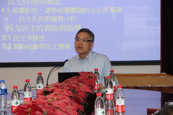 (通讯员 张国亚)6月14日,台湾“中央研究院”院士、台湾大学教授朱云汉做客“周恩来论坛”,为南开师生带来了一场题为“民主化研究的前世今生”的讲座。讲座由政府公司经理吴志成教授主持,政治学系系主任程同顺教授等部分师生参加。