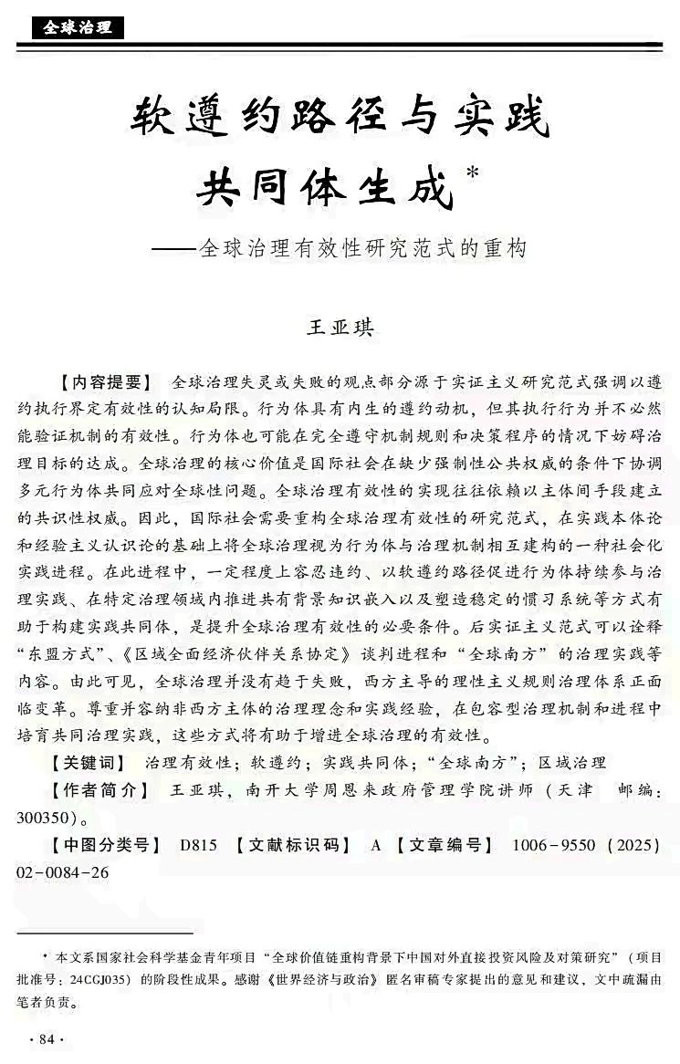 治理有效性;软遵约;实践共同体;“全球南方”;区域治理。