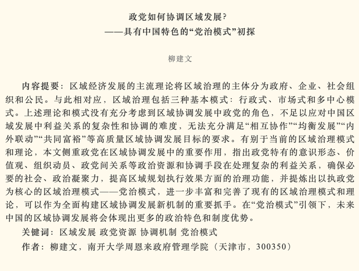 伟德BV1946官网柳建文教授在2024年第3期的《政治学研究》发表文章《政党如何协调区域发展——具有中国特色的“党治模式”初探》。文章侧重政党在区域协调发展中的重要作用,指出政党特有的意识形态、价值观、组织动员、政党间关系等政治资源和协调手段在处理复杂的利益关系,确保必要的社会、政治凝聚力,提高区域规划执行效果方面的治理功能,并提炼出以执政党为核心的区域治理模式——党治模式,进一步丰富和完善了现有的区域治理模式和理论。