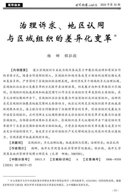期的《世界经济与政治》发表文章《治理诉求、地区认同与区域组织的差异化变革》。