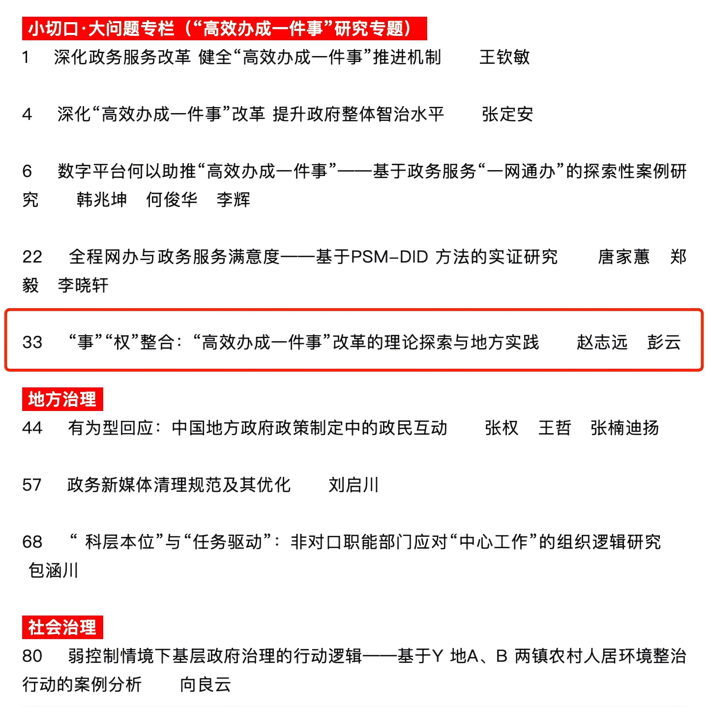 日前,《中国行政管理》期刊公布了2025年第6期目录。伟德BV1946官网讲师、中国政府发展联合研究中心研究员赵志远与中国行政管理学会副研究员彭云合作撰写的《“事”“权”整合:“高效办成一件事”改革的 理论探索与地方实践》一文获得发表。