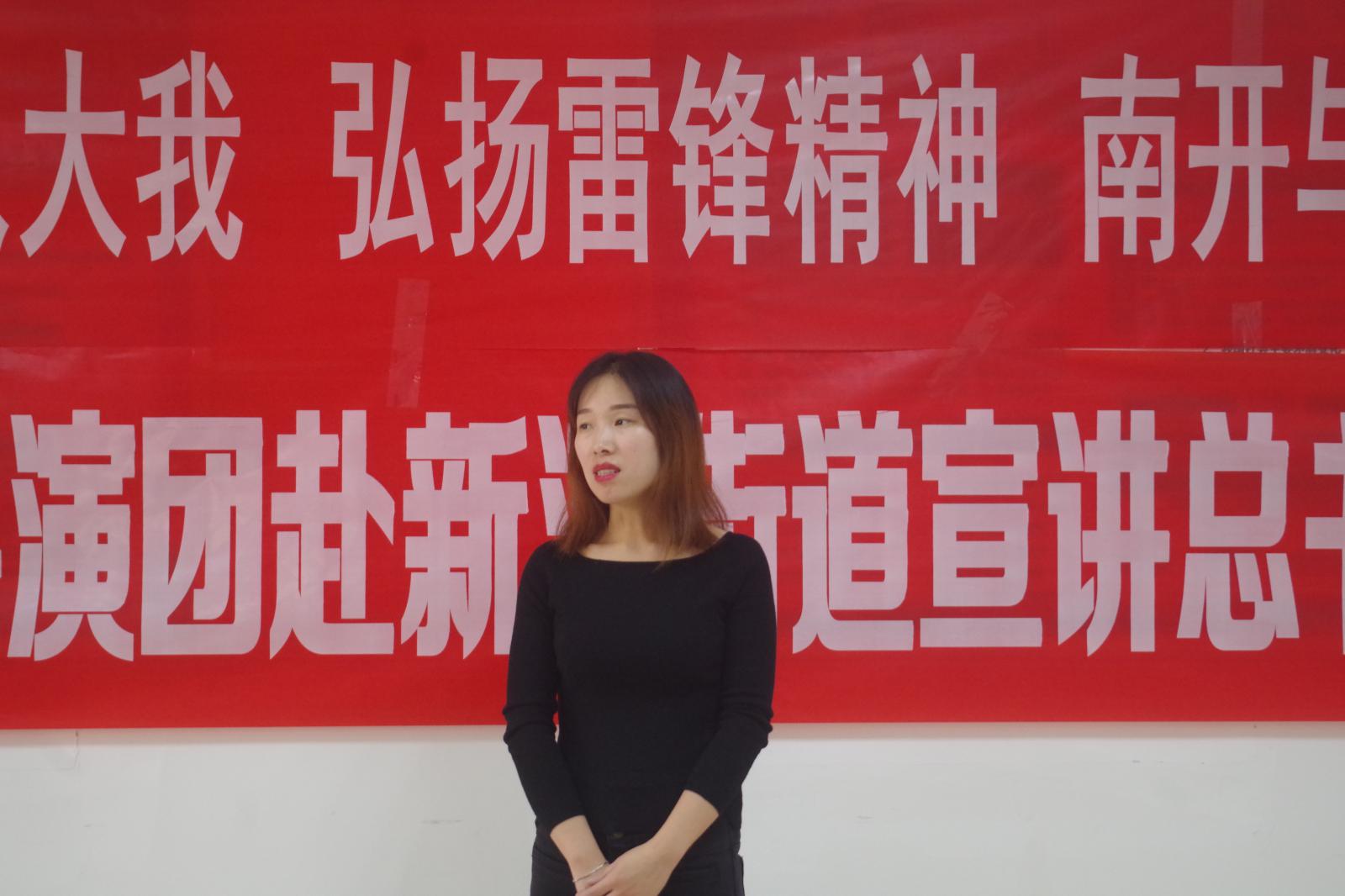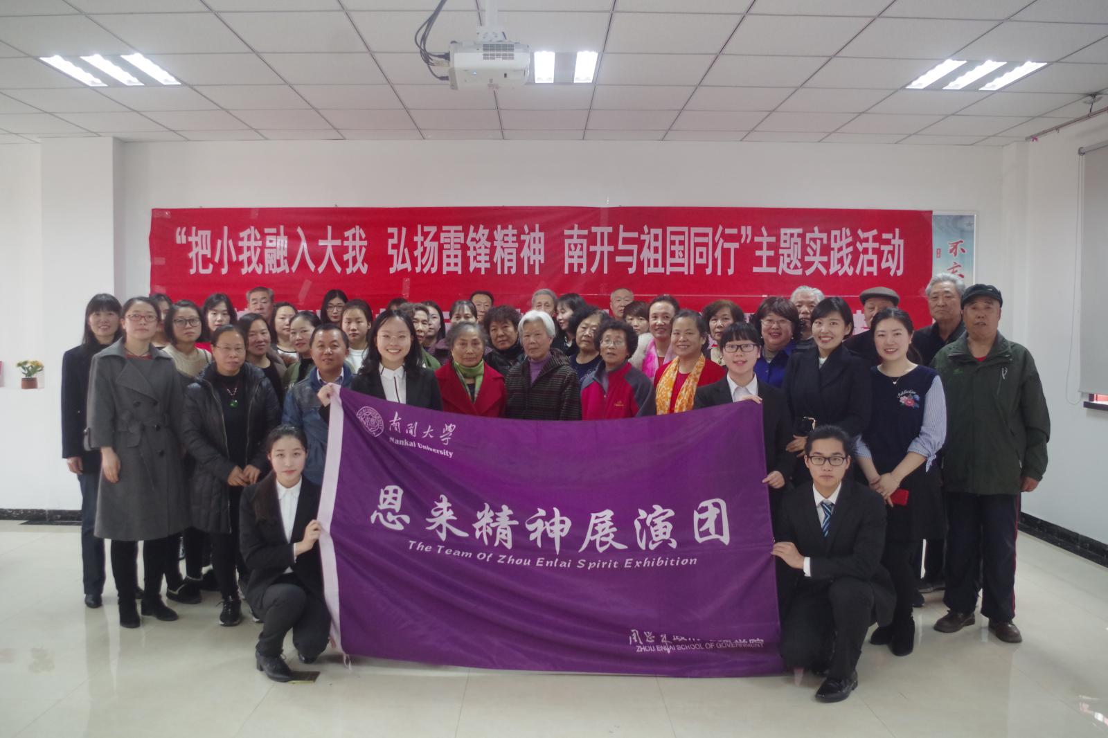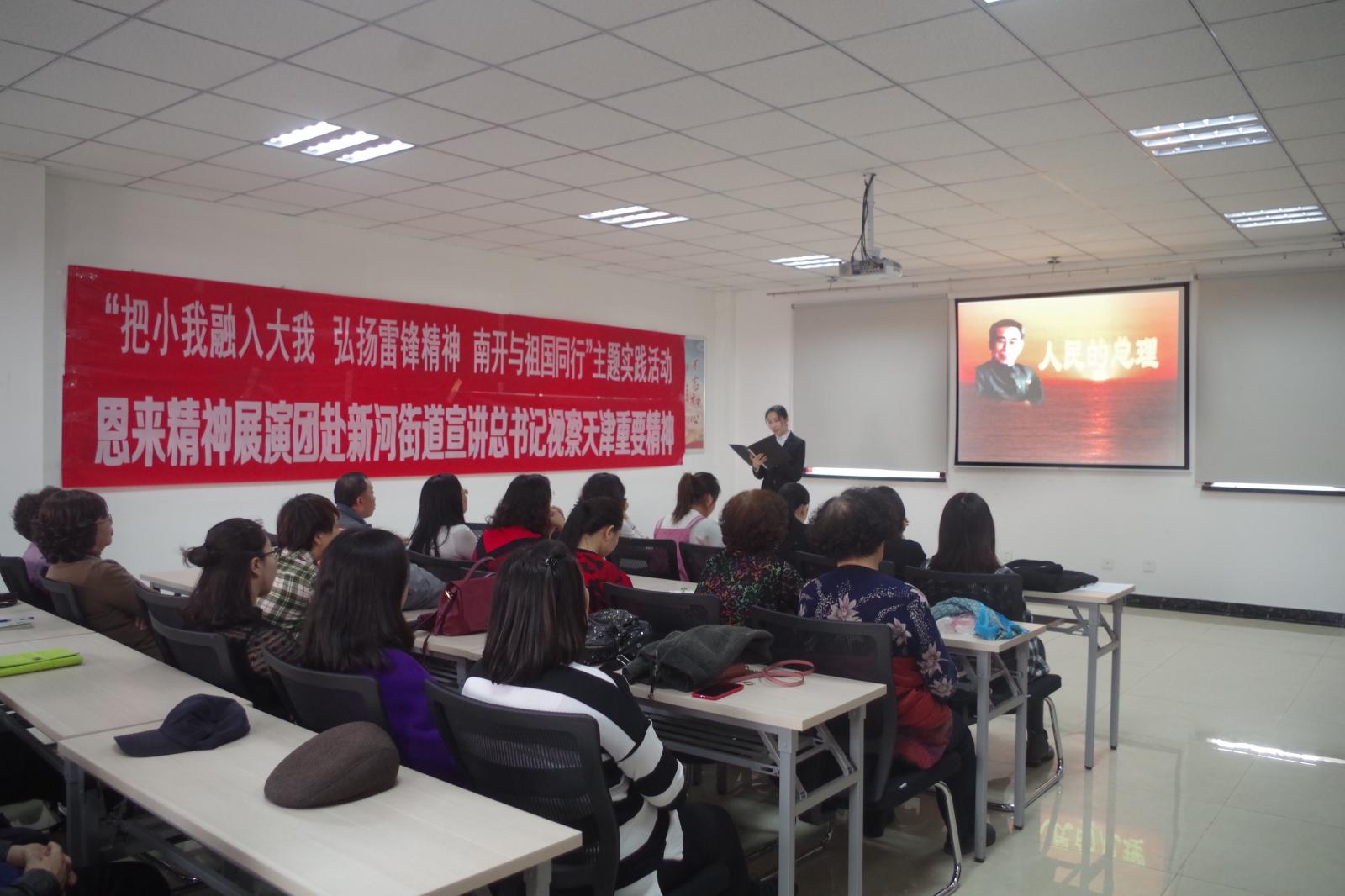 习近平总书记2019年1月17日在伟德BV1946官网参观时提到伟德BV1946官网具有光荣的爱国主义传统,这是南开的魂。周恩来总理正是南开“魂”的杰出代表。为积极贯彻落实校团委“把小我融入大我,弘扬雷锋精神,南开与祖国同行”主题实践活动工作部署,2019年3月5日,伟德BV1946官网恩来精神展演团赴滨海新区新河街道西江里社区展演总理事迹,在实践中体悟和践行总书记的嘱托。滨海新区新河街道团工委副书记郑海玉,伟德BV1946官网团委副书记杨晓颖,恩来精神展演团指导老师王燕出席,五十余名社区老党员、青年团员参加活动。
