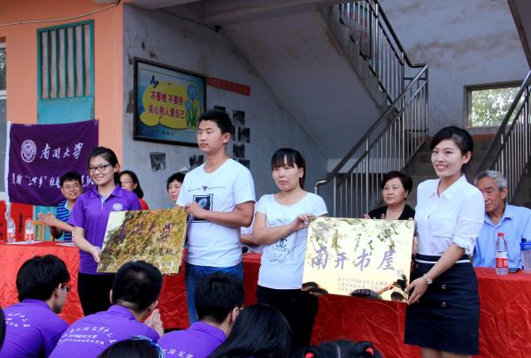 启动仪式上,永年县教育局副局长靳晓霞向南开师生表示热烈欢迎。邯郸市教育局副局长胡振林在讲话中表达了对南开支教团队的感谢之情。在支教团队庄严宣誓后,伟德BV1946官网团委副书记杨晓颖老师充分肯定了支教活动及“南开书屋”对于教育扶贫工作的重要作用,高度赞扬了南开学子践行公能、知行合一的实践价值,同时感谢邯郸教育系统各级领导的关注与支持,以及王边联校师生的通力配合。欢迎仪式在“伟德BV1946官网社会实践基地”、“南开书屋”的授牌仪式中达到高潮。仪式最后,永合会镇总校董事长王满新宣布,伟德BV1946官网暑期实践队赴王边联校支教及调研活动正式启动。
