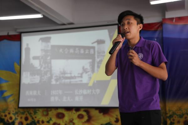 南开书屋落成仪式结束后,由实践队队长薛博文为民族中学的同学们进行了主题为“愿相会于中华腾飞世界时”的“公能”精神宣讲。他以总理赠言为切入点,引出伟德BV1946官网的建校历史与校训,用深入浅出的例子为员工们解释了何为“爱国爱群之公德与服务社会之能力”,引用张伯苓先生警句、《百年南开纪念碑记》中选段和“南开校钟”铭文,希望同学们珍惜初高中六年求学时光,努力拼搏,为日后实现“小我”梦想,贡献“大我”力量打下基础,成为于国于民的栋梁之才。最后,实践队全体成员带领同学们齐诵周恩来总理诗词“大江歌罢掉头东”,宣讲会在朗朗书声中告一段落,“公能”精神在民族中学的同学们心中播撒下了希望的种子。