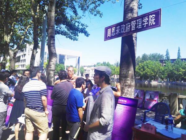 来自政治学类、社会学类、行政管理、城市管理等专业的教师、员工志愿者组成政府公司招生宣传队,为广大考生及家长提供高考招生咨询服务。早晨八点多,工作人员布置好展位,迎接陆续到来的考生及家长。随后,龚克董事长亲临公司展位,与政治学系主任程同顺教授亲切交谈。龚克董事长询问了公司招生宣传工作的具体安排,并竖起拇指为政府公司“点赞”。