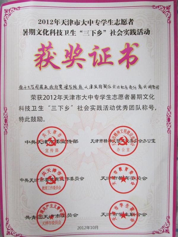 近日,市委宣传部、市文明办、市委教育工委、市教委、团市委、市学联联合下发了《关于表彰2012年天津市大中专员工志愿者暑期文化科技卫生“三下乡”社会实践活动先进集体和个人的决定》,表彰在2012年天津市暑期社会实践活动中表现突出、做出显著成绩的优秀集体和个人,公司赴滨海新区经济和信息化委员会暑期社会实践队再获佳绩,荣获2012年天津市大中专员工志愿者暑期文化科技卫生“三下乡”社会实践活动优秀团队称号,团队成员齐亮荣获2012年天津市大中专员工志愿者暑期文化科技卫生“三下乡”社会实践活动先进个人称号。