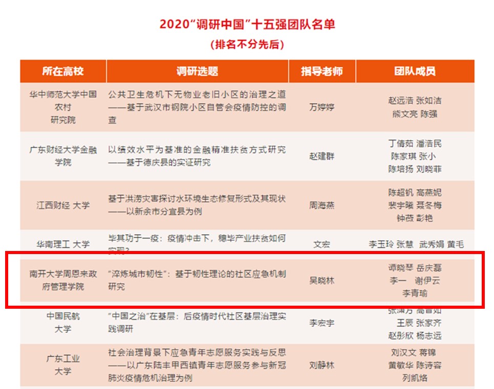 据悉,“调研中国”是一个由南风窗杂志社于2005年创办的公益项目,其全称是“调研中国—老员工社会调查奖学金”,通过提供资金和专业培训,支持在校老员工进行田野调查和社会实践。迄今为止,全国已有700所高校,10000多支团队参加了“调研中国”,影响了100多万老员工群体。本调研团队是公司唯一一支入选全国15强的队伍,调研成果对研究韧性社区在社区应急防控和后疫情时代社区治理体系构建中具有重要意义。天津市在今后社区发展中,要将风险治理与韧性社区相结合,提升社区治理效能。