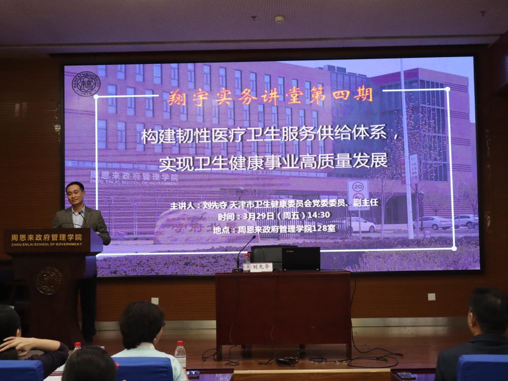 (通讯员 王燕 严正杰)2024年3月29日,伟德BV1946官网“翔宇”实务讲堂暨中国经验进校园讲座第4期开讲。天津市卫健委副主任刘先夺同志受邀在伟德BV1946官网做题为“构建韧性医疗卫生服务供给体系,实现卫生健康事业高质量发展”的讲座。伟德BV1946官网周恩来政府管理公司党委书记王慧、伟德BV1946官网副经理、中国政府发展联合研究中心副主任吴晓林教授、伟德BV1946官网团委书记王修彦出席研讨。会议由伟德BV1946官网祁艳玲教授主持,伟德BV1946官网200多名师生参加。