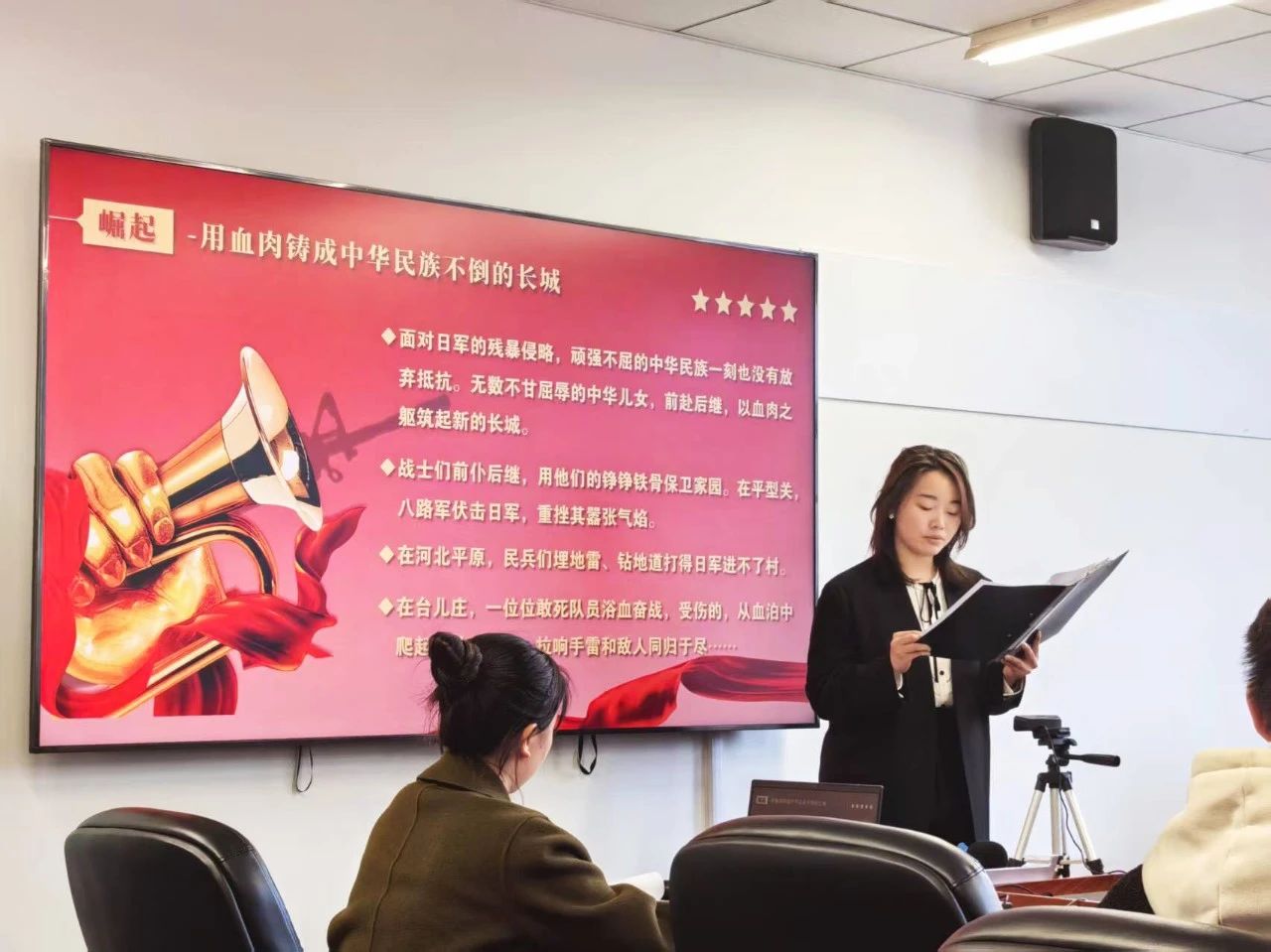 今年恰逢抗日战争胜利八十周年,活动伊始,与会人员集体观看了《清明雨润祭忠魂,英烈精神铸国魂》的主题视频,重温了革命先烈为民族解放事业英勇献身的壮烈史诗。随后,2023级本科生国际政治班团支部进行了《八秩丰碑凝碧血,千秋浩气铸国魂》的主题团课。本次团课通过“回眸”、“崛起”、“迎来”、“铭记”、“礼赞”五个篇章,用一段段鲜活的历史,一幕幕动人的场景,带领各位同学走进了抗日战争那段波澜壮阔的历史画卷,让大家深切感受到先烈精神的永恒力量,令大家心潮澎湃、收获颇丰。