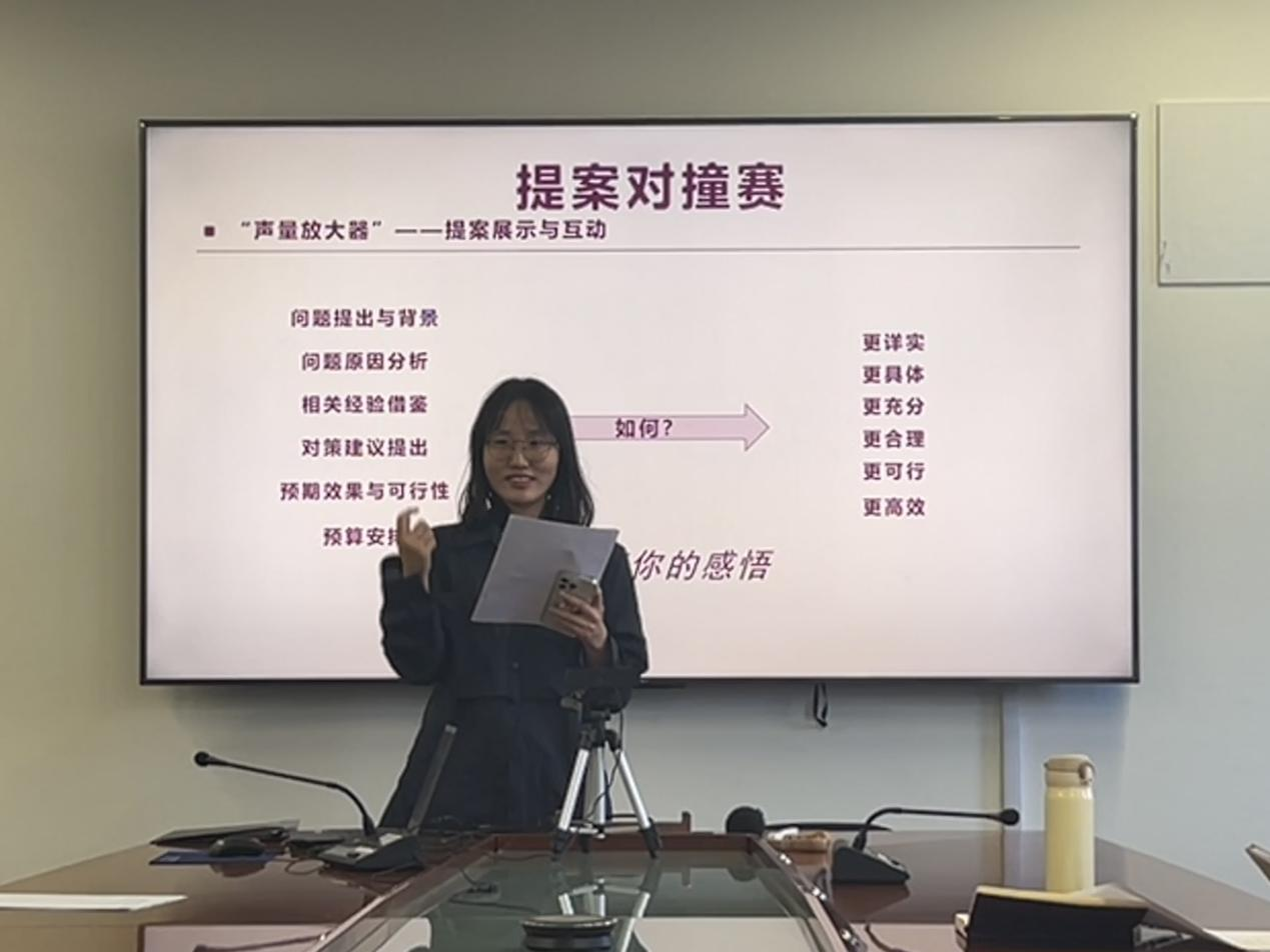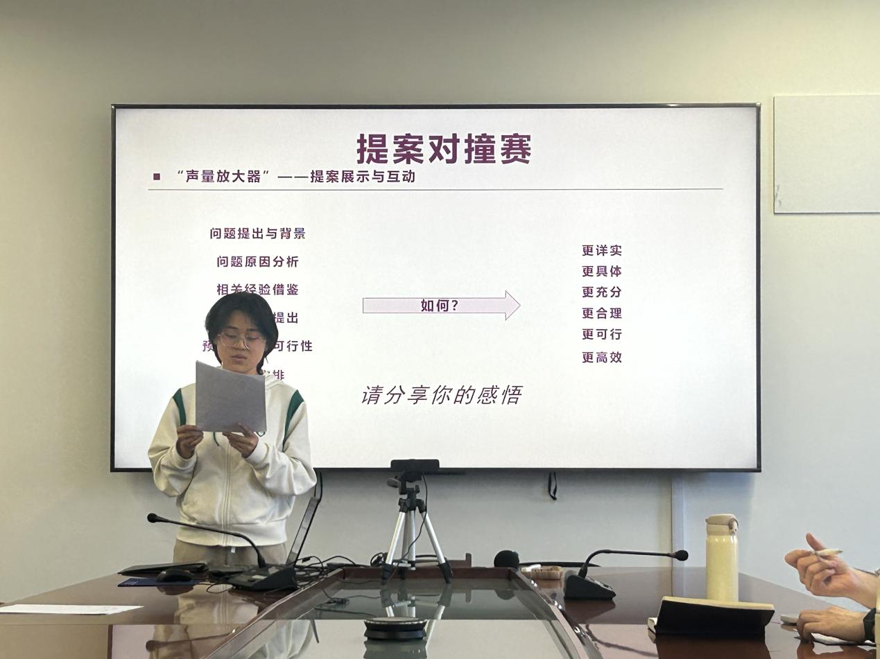 会议第三部分是充满活力与创意的“提案对撞赛”。参与者们自由组队,围绕公司产品、成长成才、生活服务、权益维护四大主题展开了探索思考。各个小组积极讨论、热烈交流,充分发挥团队智慧,构思提案内容。展示环节中,小组代表上台展示提案构思,现场气氛热烈,同学们积极提问、补充,形成了良好的互动交流氛围。