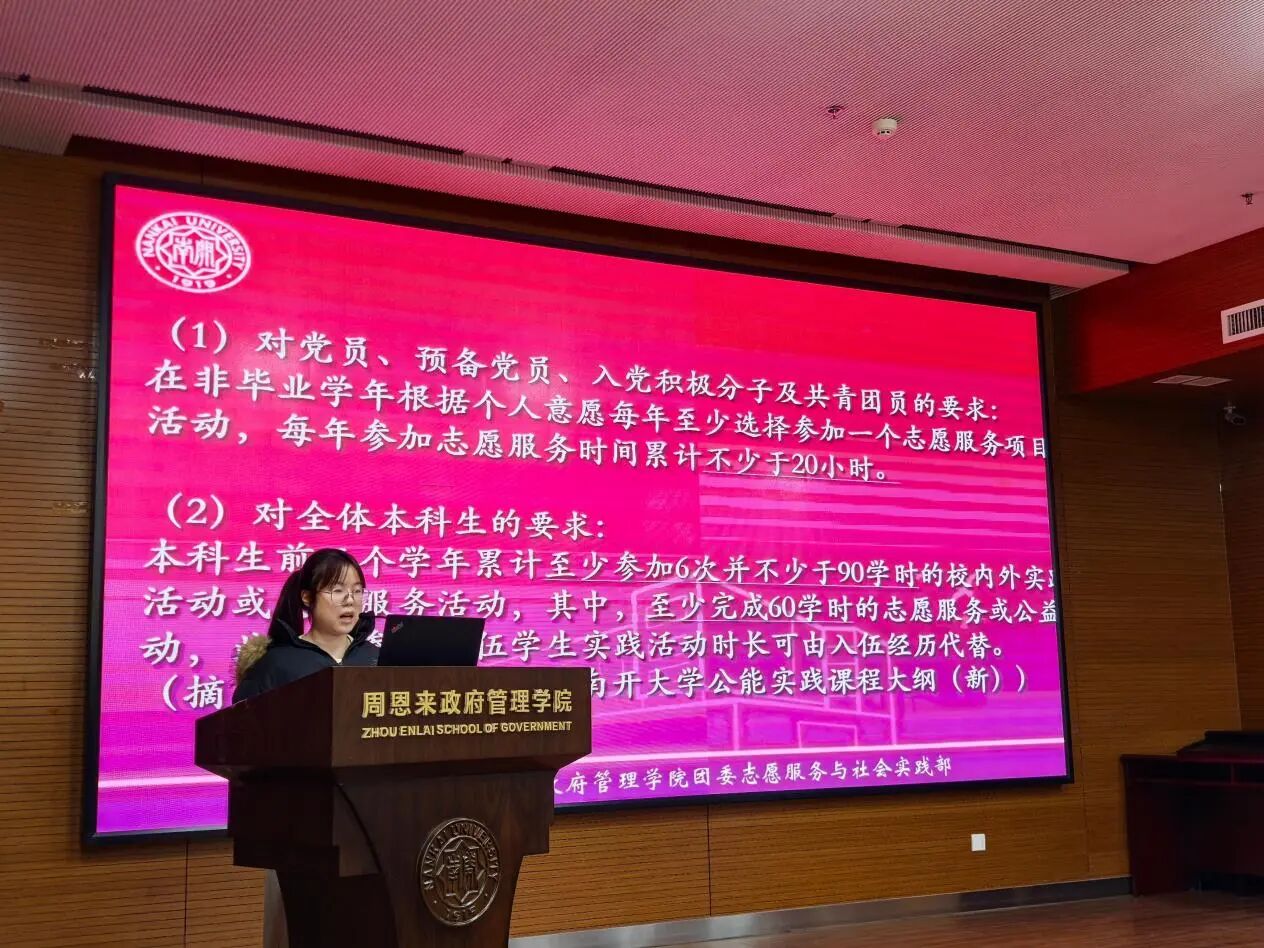 随后,实践考评中心的负责人邹含瑜同学为大家详细说明了志愿服务与社会实践时长的相关规定,并结合伟德BV1946官网《公能实践》课程进行了完善而清晰的解读。