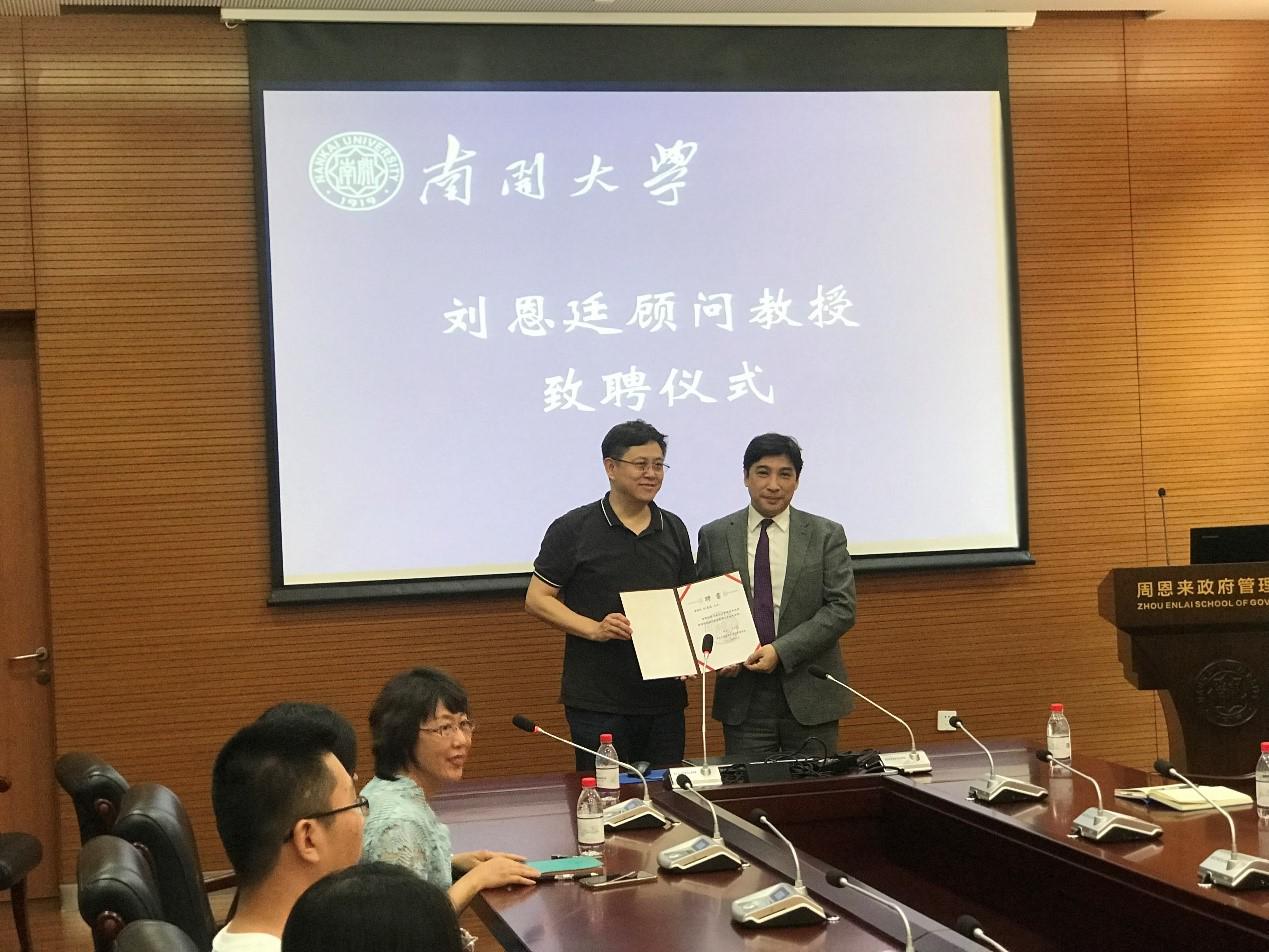 朱光磊向刘恩廷先生受聘为顾问教授表示祝贺,并在致辞中指出,一直以来,刘恩廷先生十分关心、关注伟德BV1946官网的建设和发展,不论是在校期间勤勉学习,倾情投入南开发展的事业;还是在台期间深入开展与母校的交流合作,凝聚员工力量,提高南开在台声誉,刘恩廷先生都保持着“允公允能、日新月异”的南开情怀,都为伟德BV1946官网的建设和发展做出了杰出的贡献。朱光磊表示,在刘恩廷先生的大力支持下,伟德BV1946官网要进一步深化同台湾地区的交流与合作,推进两岸关系平稳发展,奋力谱写新百年育人强校的新篇章。