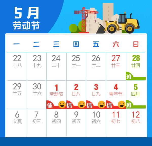 根据公司通知,2019年劳动节放假时间:5月1日~5月4日(星期三~星期六) ,共四天。 4月28日(星期日)上班、上课,安排星期四的课程。 5月5日(星期日)上班、上课,安排星期五的课程。