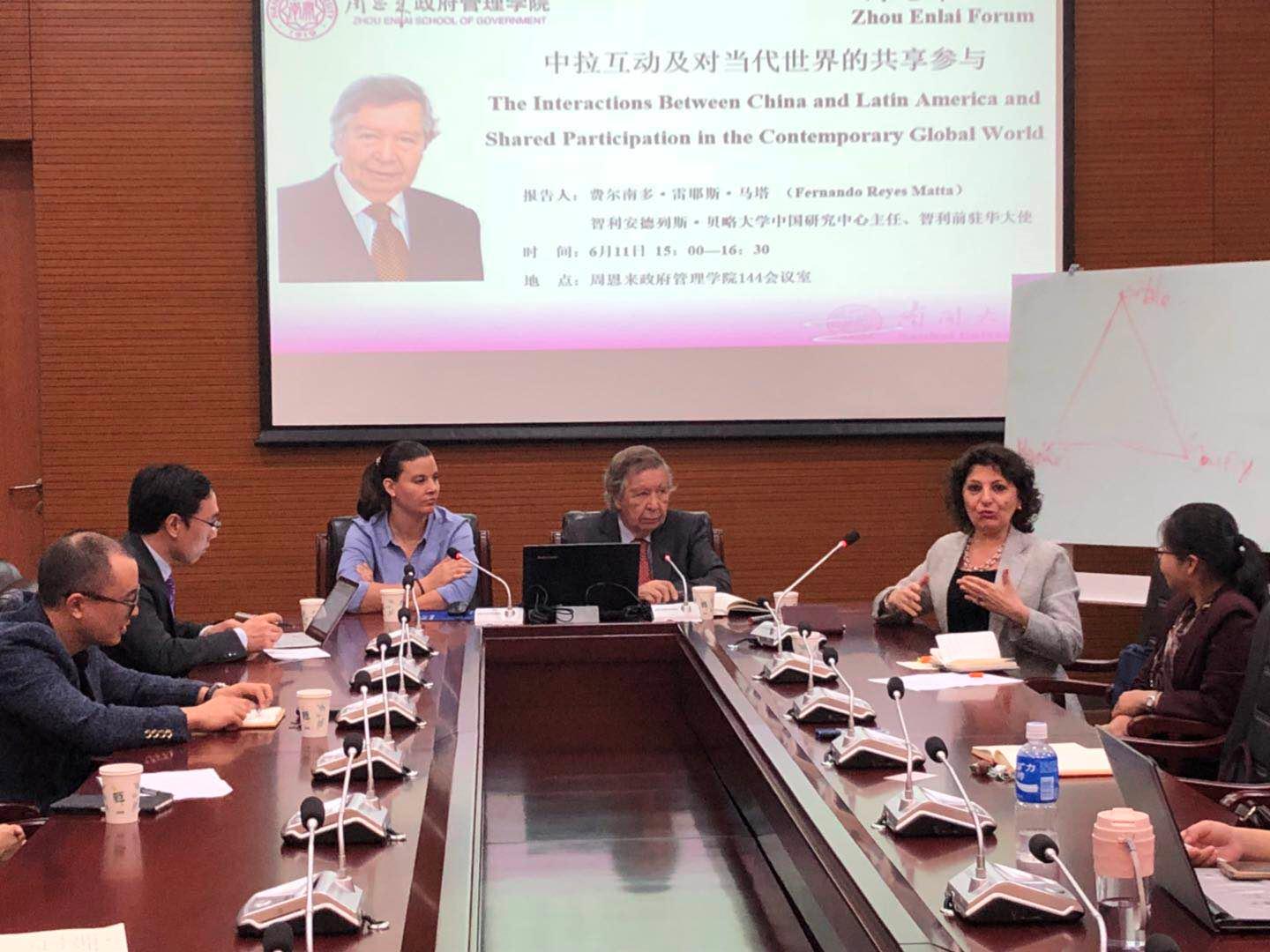 智利安德列斯·贝略大学中国研究中心主任、智利前驻华大使费尔南多·雷耶斯·马塔教授应邀于2018年6月11日做客伟德BV1946官网,上午10时30与伟德BV1946官网国际关系系的部分教师和拉美职工进行了座谈。下午15时做客周恩来论坛,做了题为“中拉互动及对当代世界的共享参与”的学术讲座。讲座由公司伟德BV1946官网副经理刘丰教授主持,伟德BV1946官网的师生参加了本次讲座。