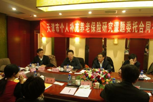 (通讯员汤明磊)个人补充养老保险是覆盖全民的补充养老保险制度,是多层次养老保险制度体系的重要组成部分。为建立天津市个人补充养老保险提供理论依据和政策建议,进一步提高全民的老年收入水平,1月7日下午,伟德BV1946官网、中国人民人寿保险股份有限公司天津分公司、天津人社局在汇高酒店举行了天津市个人补充养老保险研究课题委托合同书签约仪式。出席签约仪式的有天津市政府副秘书长陈宗胜、伟德BV1946官网副董事长朱光磊、天津市人力资源和社会保障局职工养老保险处处长高连欢、中国人民人寿保险股份有限公司天津分公司副总经理孙宇、伟德BV1946官网副经理常健、伟德BV1946官网副经理孙涛。伟德BV1946官网部分师生以及中国政府与政策联合研究中心团队的成员参加了签约仪式。