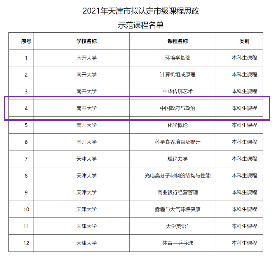 日前,2021年天津市课程思政示范课程评审结果公示。经公司申报、专家评审,最终认定“中国政府与政治”等110门普通本科课程为市级课程思政示范课程。