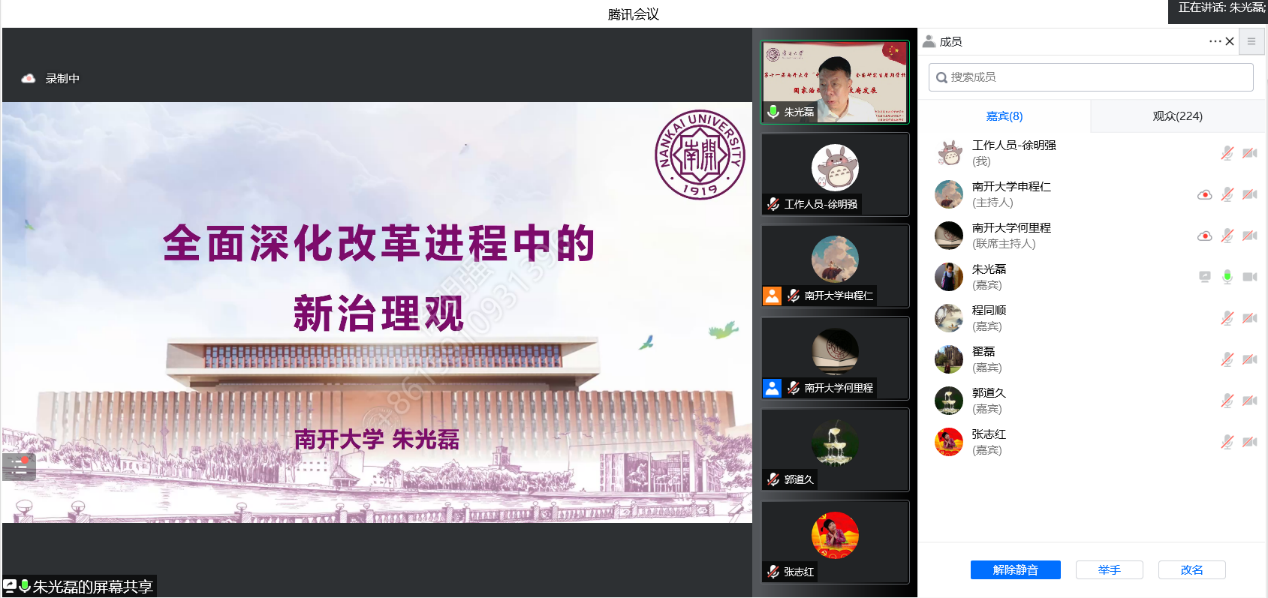 开幕式结束后,朱光磊教授带来了以“全面深化改革进程中的新治理观”为主题的讲座。朱光磊教授从对“治理”的概念辨析入手,以狭义的新治理观为统领,就新职能观、新角色观、新政社观、新政绩观、新审管观、新央地观、新城乡观等多个角度,对全面深化改革进程中的新治理观进行了探讨。