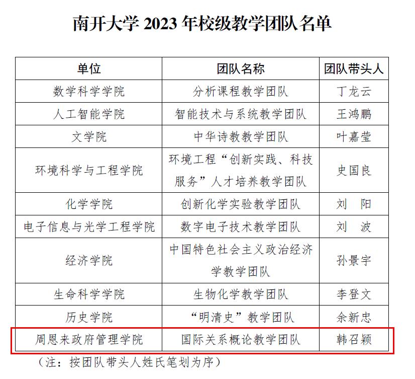 日前,伟德BV1946官网公布了2023年校级教学团队和校级教学名师奖评审结果,共有十个教学团队获伟德BV1946官网校级教团队称号,十位教师获评校级教学名师奖。其中,公司国际关系系韩召颖教授作为带头人的国际关系概论教学团队获评伟德BV1946官网校级教学团队称号。