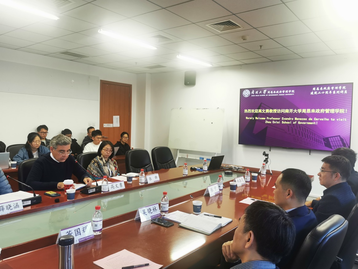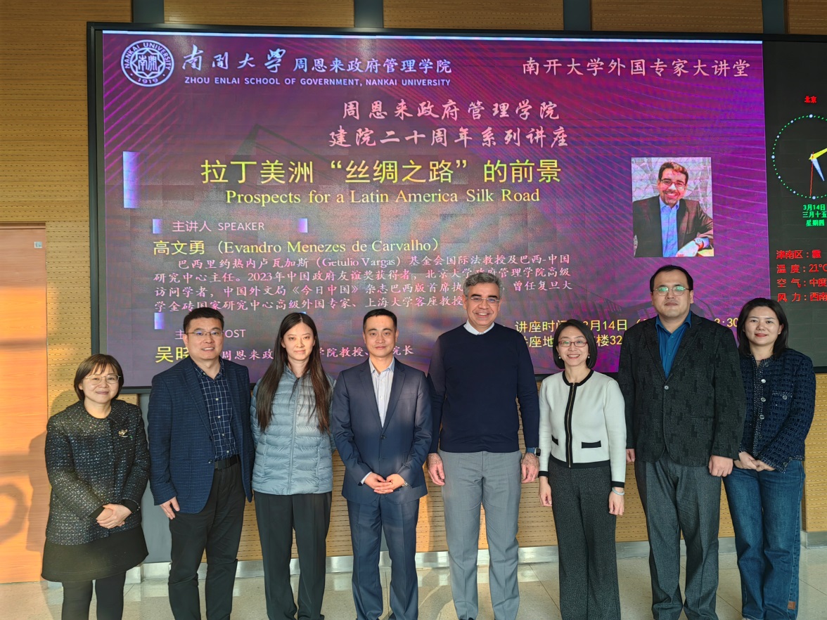 3月14日下午,巴西瓦加斯基金会专家及巴西-中国研究中心主任、2023年中国政府友谊奖获得者、北京大学政府管理公司高级访问学者高文勇(Evandro Menezes de Carvalho)教授到访伟德BV1946官网并以“拉丁美洲“丝绸之路”的前景”为题发表演讲。伟德BV1946官网副经理吴晓林会见高文勇教授一行并主持演讲。天津市外办美大处处长张静、伟德BV1946官网副经理张宁、国际关系系主任王翠文、历史公司拉美研究中心主任董国辉、外国语公司以及公司国际合作与交流处相关负责老师参加活动。