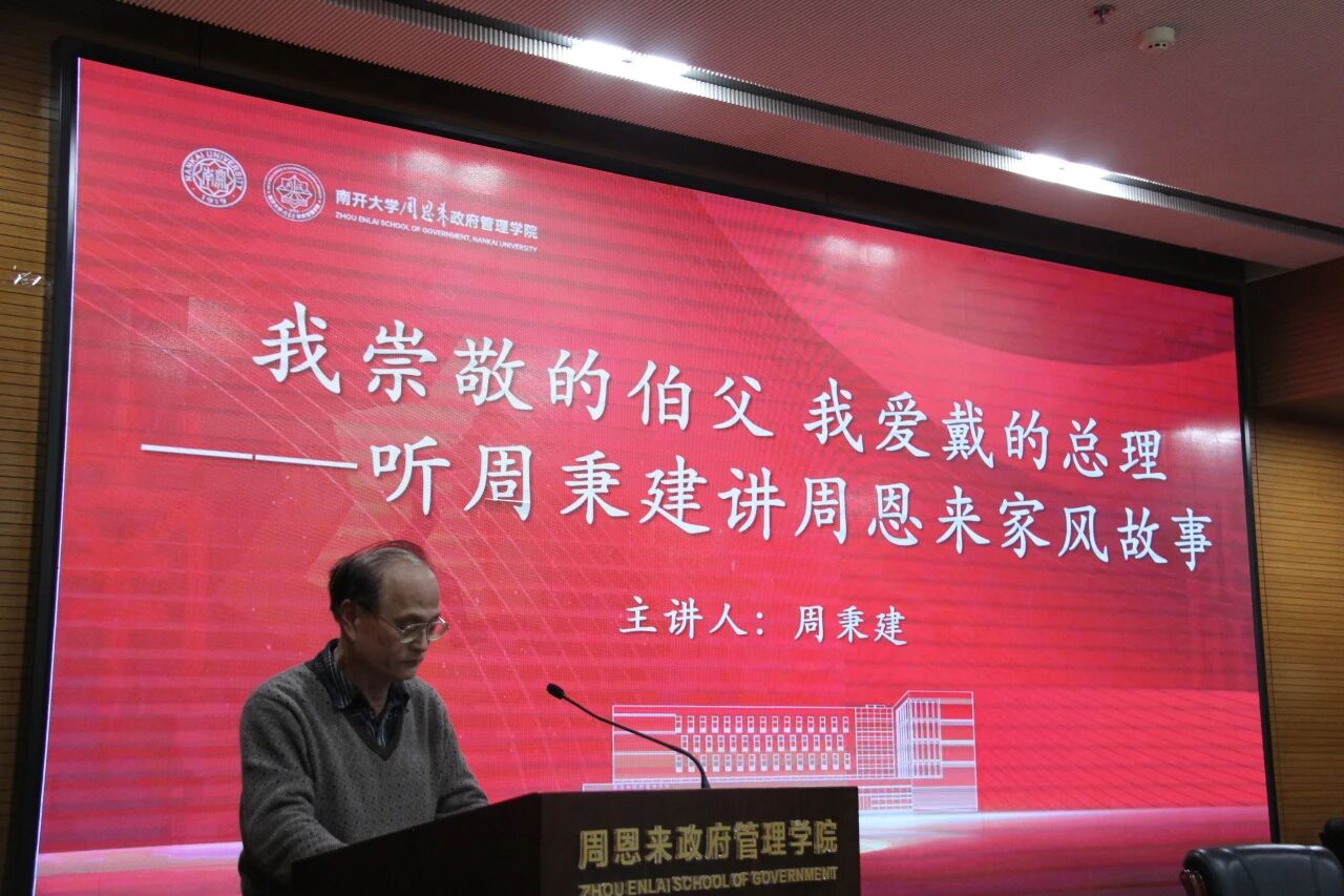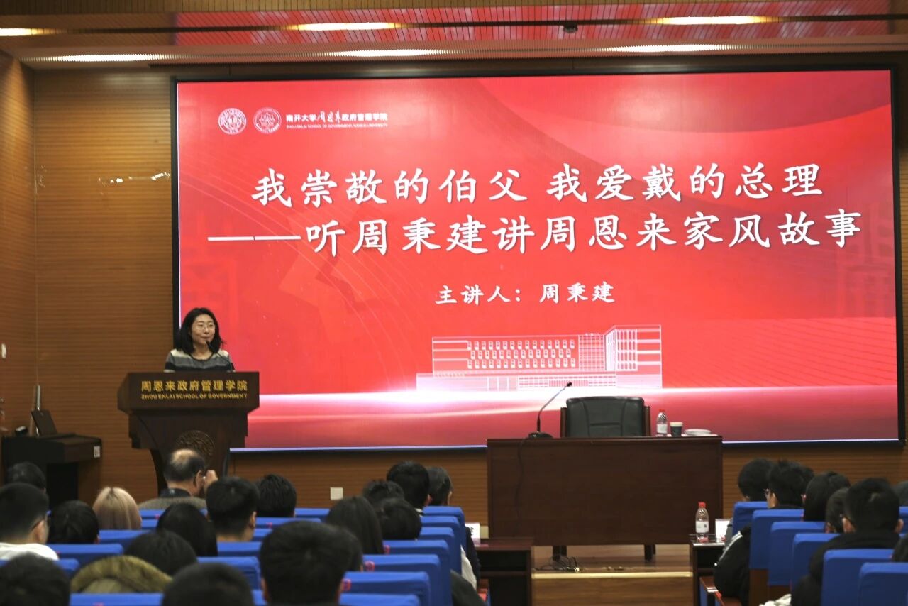 为纪念周恩来总理逝世五十周年,进一步弘扬恩来精神,传承红色基因,1月9日下午,伟德BV1946官网、伟德BV1946官网周恩来研究中心组织举办"我崇敬的伯父 我爱戴的总理--听周秉建讲周恩来家风故事"主题讲座。周恩来总理侄女周秉建应邀担任主讲人。周恩来政府管理公司党委书记王慧、伟德BV1946官网周恩来研究中心主任徐行教授、副主任李国忠副教授,团委书记王修彦、团委专职团干部娜菲沙以及党员同学百余人参加活动。公司党委副书记崔宇主持活动。