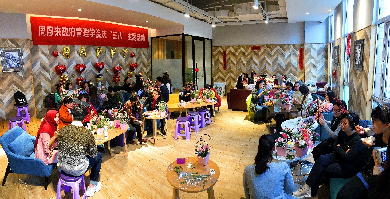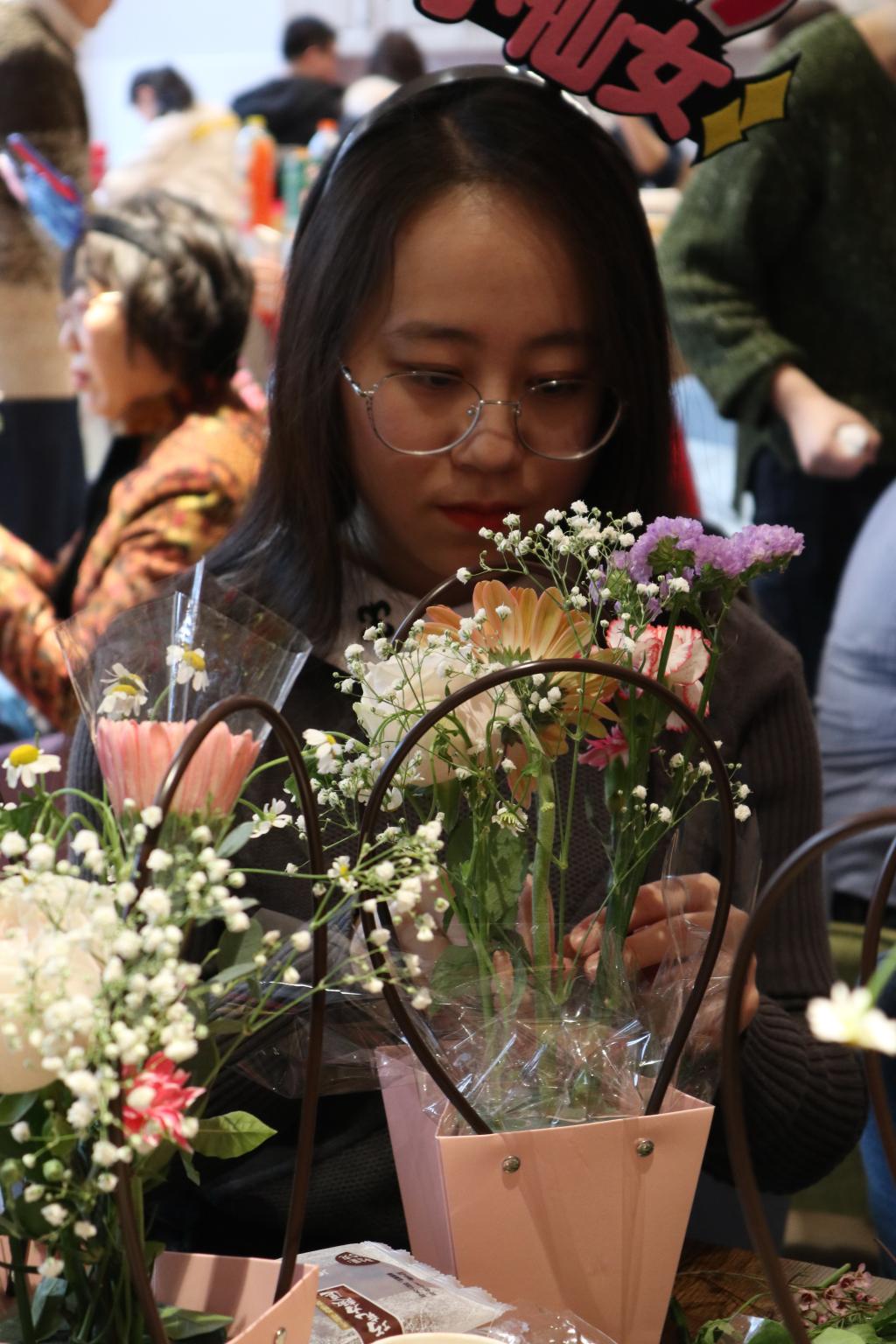 娇艳的玫瑰,浪漫的康乃馨,甜美的满天星……活动现场馥郁芬芳,气氛热烈。在场师生认真学习插花的基本知识和技巧后,对花草进行修剪枝叶、搭配颜色、设计造型和调整布局,亲手完成了一件件匠心独运的花艺作品。师生们以花寓意,互道祝福,交流了对新时代女性精神的理解与感悟。大家欣赏着自己亲手完成的插花作品,幸福的笑容洋溢在嘴角。师生们手捧着作品亲密合影,纪念这难忘的一刻。