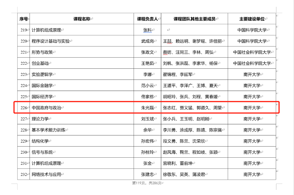 由首批“国家级教学名师”、伟德BV1946官网讲席教授、中国政府发展联合研究中心主任朱光磊教授担纲课程负责人的 “中国政府与政治”本科课程作为唯一一门“中国政治”类课程成功入选。